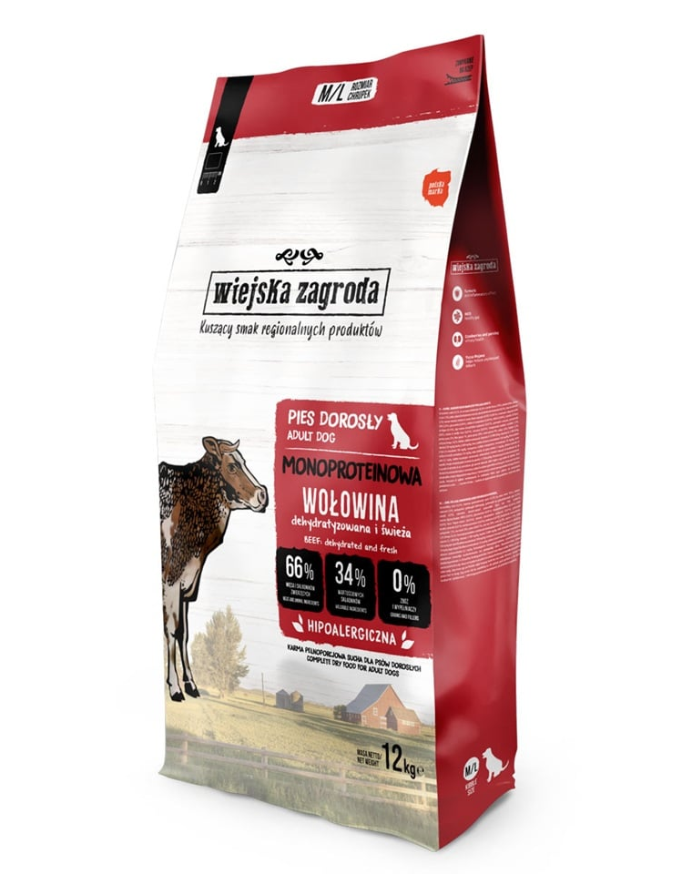 Linia de hrană monoproteică Wiejska Zagroda este o hrană echilibrată, dedicată câinilor cu tract digestiv sensibil și predispuși la alergii. Utilizarea unui singur tip de proteină animală, absența cerealelor și a leguminoaselor reduc riscul apariției reacțiilor alimentare nedorite, iar numeroasele ingrediente cu rol benefic susțin digestia corectă și pot ameliora inflamațiile cauzate de alergii sau probleme gastrointestinale recurente. Ingredientele acestei hrane contribuie, de asemenea, la sănătatea pielii și la prevenția afecțiunilor articulare. Hrană monoproteică furnizează toți nutrienții necesari funcționării optime a organismului câinelui adult. Conținutul ridicat de carne și ingrediente animale – 66% – precum și nivelul mare de proteine animale ajută la menținerea masei musculare, iar nivelul echilibrat de grăsimi oferă energia necesară activităților zilnice. Legumele și fructele completează rețeta cu vitamine și minerale valoroase, având grijă de vedere, piele, sistemul nervos și ficat.