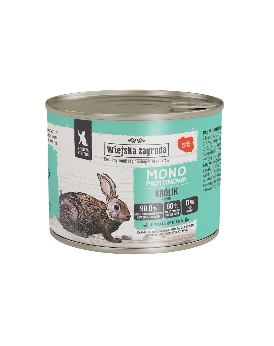 Hrană umedă completă, monoproteică, pentru pisoi. Wiejska Zagroda Monoproteic Iepure este o hrană umedă completă destinată pisoiilor, formulată cu o singură sursă de proteină animală. Fiecare conservă conține un singur tip de carne, iar ingredientul principal este întotdeauna carnea, aflată pe primul loc în compoziție.