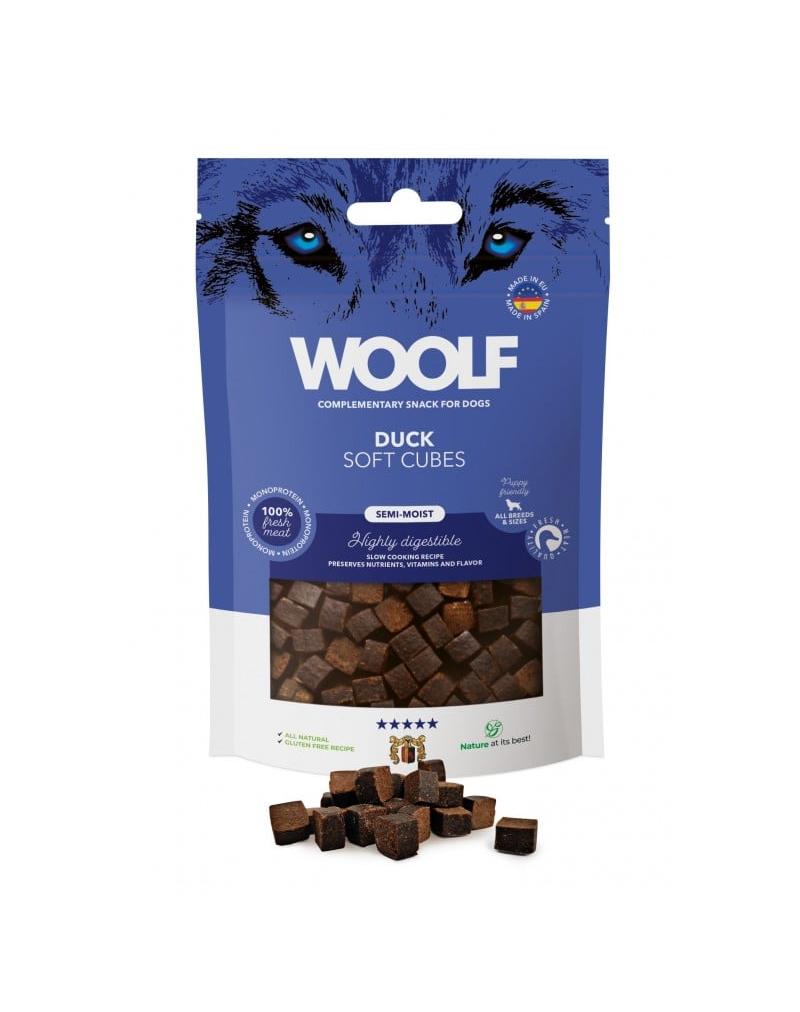 WOOLF Soft Cubes Duck Monoprotein sunt cuburi fără cereale și fără gluten, preparate cu rață ca unică sursă de proteine.