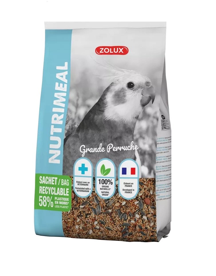 ZOLUX NUTRIMEAL 3 pentru papagali de talie mare conține 50% mei, care are un conținut scăzut de grăsimi pentru a preveni obezitatea.