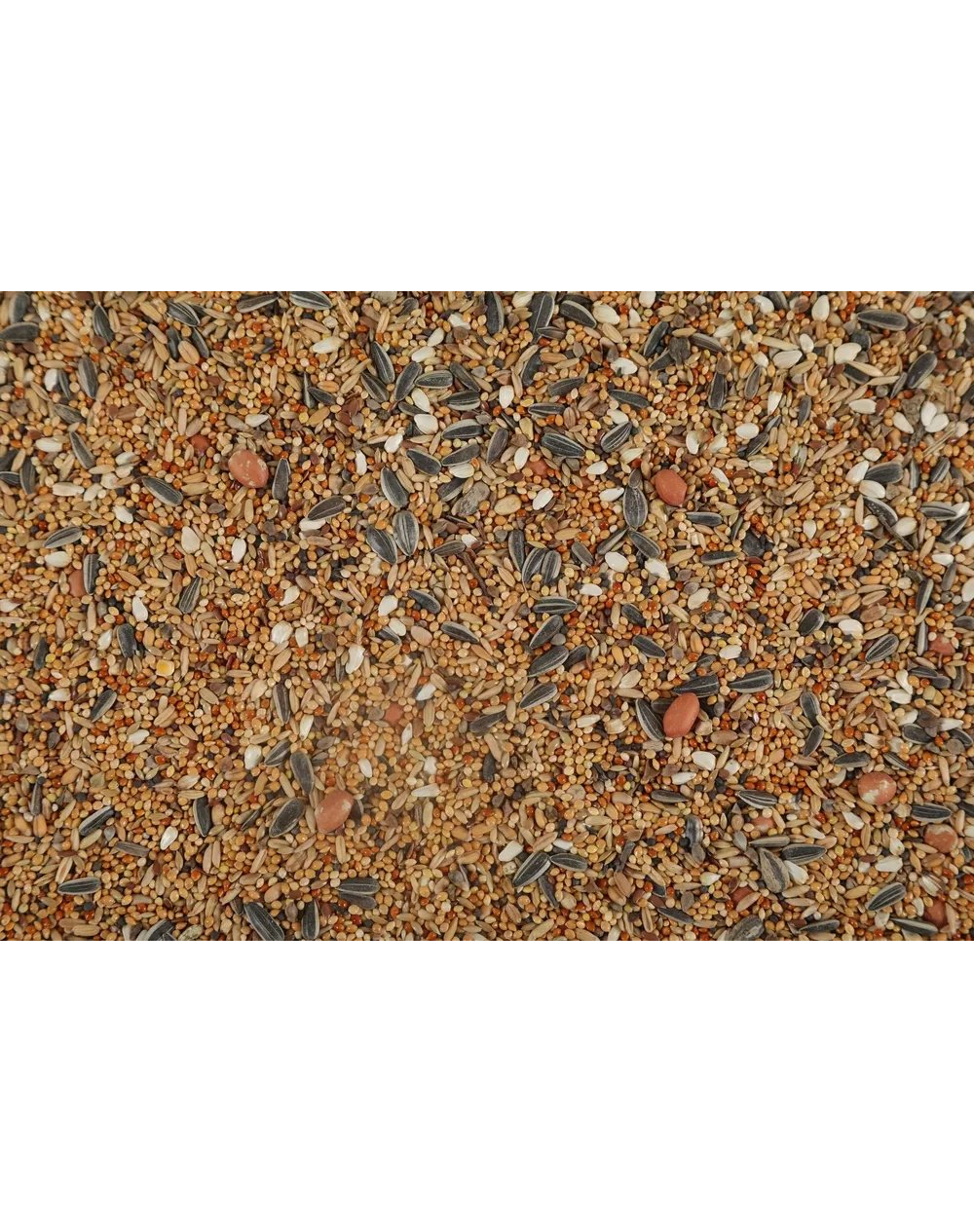 Mei 50% (mei galben, mei alb, mei roșu), semințe de șofrănel, semințe de hrișcă, ovăz decorticat, iarbă de canar, semințe de niger, semințe de floarea-soarelui, grâu, semințe de rapiță, semințe de in, orez nedecorticat, arahide decorticate, ulei de rapiță.